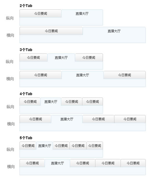 这时,我们的选项卡宽度就不能是一个固定值,而要使用百分比了。对于2、4、5这样能被100%整除的数,这个取值很容易,每个选项卡的宽度就是50%、25%、20%;对于3、6、7这样不能整除的数,应该怎么办呢?哈,幸好我们还有一点数学基础,以一组3个选项卡为例:33.3% + 33.3 + 33.4%这样的分法也不错,加起来能够凑到100%,选项卡之间0.1%的宽度差,应该是0.3-0.4像素,可以忽略。好,让我们看看这样的分法结果如何?