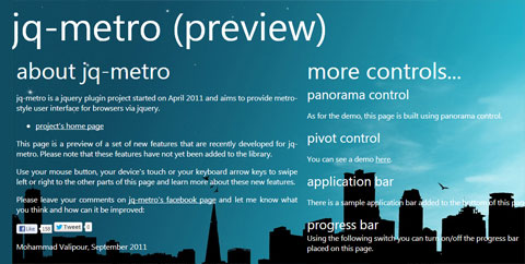 一个jQuery插件,用来创建Metro风格的界面。目前包含Panorama、Privot、进度条、列表选择、切换、按钮等。
