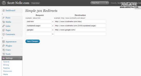 Simple 301 Redirects插件可以把你希望301重定向到其它页面或站点的URL全部集合并排成列表。如果你整准备把某个站点整合到WordPress,这个插件实在是相当实用,而且她不会破坏原有的URL结构。Simple 301 Redirects插件可以完整保留原有URL的所有状态。