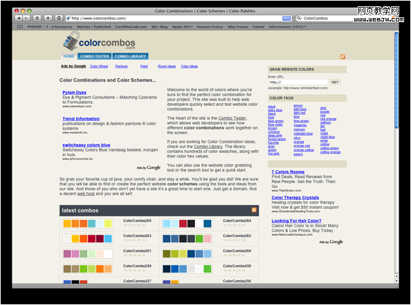 配色是 Web 设计的首要大事,Color Combos 帮你预备了数千种配色方案,可以根据色调浏览选取。
