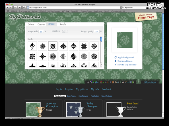 现代 Web 设计的趋势之一包括使用背景图案,BgPatterns.com 可以帮你设计背景图案,他们有大量可选的图案,可以按不同方式接合,还可以设置透明度。