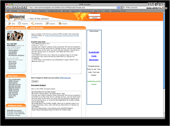 如果你要在网站中显示 Web 代码,那将是非常烦人的事,你必须将诸如 < 一类的符号用编码表示,这个网站可以帮你做这些事情,只需将你的代码复制进去,他们会帮你生成可以直接使用的代码。还有 HTML Decoder 帮你做相反的事。