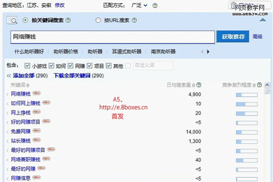 2)使用关键字推荐工具,输入你想要模糊匹配的关键字,如“网络赚钱”