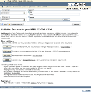 Validome.org:Validome就像验证器的一站式商店。这个网站提供各种工具,来检查你的HTML,XML,DTD-Schema,RSS,以及Google Sitemaps。每个工具都大量的选项,调整它们来满足你的需求。