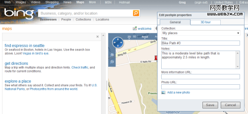 当你在必应地图上搜索位置并找到想找的东西的时候,你可以把该位置添加进与你的MSN账号绑定的收藏里。这样的话,当你需要在找那个位置的时候,就可以打开你的收藏然后快速访问到它。只需右键点击地图,选择“添加图钉”,填写图钉的属性表单(图E),然后点击保存。你就可以通过邮件或Windows Live博客分享自己的收藏了。
