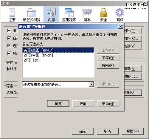 对于Firefox用户来说,在工具—选项—内容—语言选择中设置,设置方法和IE相同。设置界面如下图所示。