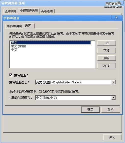 对于Google Chrome用户来说,在选项—中级用户选项—更改字体和语言设置—语言中修改,设置方法和IE相同。设置界面如下图所示。