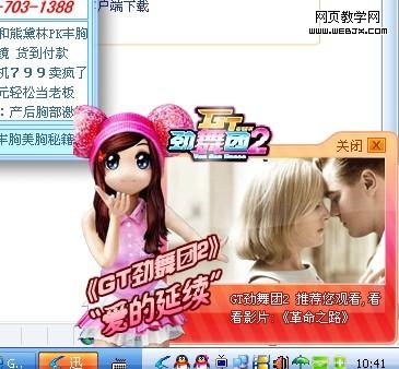 GT劲舞团2的推广可以说是一种全天候立体式轰炸的推广。从桌面到网站到论坛铺天盖地全是GT劲舞团2的广告。桌面客户端部分利用迅雷投放广告(见截图1)