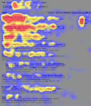 4、人们对搜索引擎,比如Google的搜索结果页面的反应也是F型的,人们往下看搜索结果,也是勉强的,换句话说,将你的网站排名在搜索结果页的前一两位,直接决定了你网站受关注的程度。
