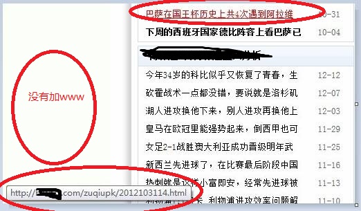 2.当我们优化这一篇巴萨在国王杯历史上共4次遇到阿拉维斯(www.域名.com /***/2012103114.html)这一篇文章时,我们以遇到阿拉维斯为描文本,通过其它的站点,自建博客,以及知名博客,还有其它网站指向这一篇文章时(超链接为http:// www.域名.com /****/2012103114.html),由于这一篇文章还有多种访问方式,所以这一篇文章的权重无法集中,这样权重就可能被会为1/2权重.