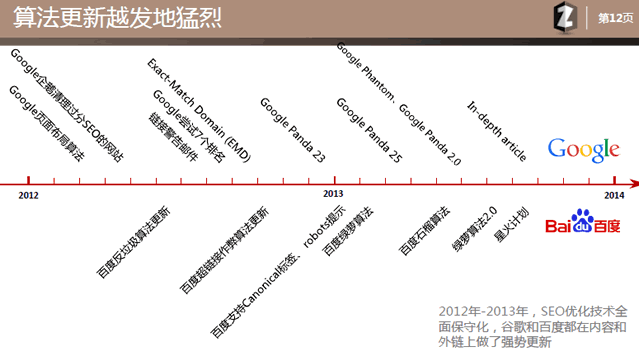 除了基本面外,我们要稍微提醒客户目前搜索引擎处在怎么样的大环境下:也就是要告诉他们搜索引擎的算法更新是越发地猛烈。通过这页你需要去整理一下最近1-2年里百度和谷歌在算法上的变更情况,这个不仅帮助客户理解这个道理也能帮助你自己了解主流搜索引擎的算法走向。随后你需要做一个总结就是:2012年-2013年(甚至更后面),SEO优化技术全面保守化,谷歌和百度都在内容和外链上做了强势更新。我们的打法不能再是硬拼,而是要学会防守。