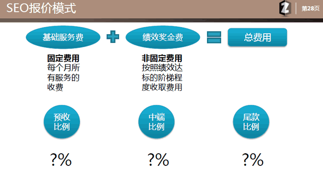 seo报价模式:总费用 = 基础服务费+绩效奖金费。