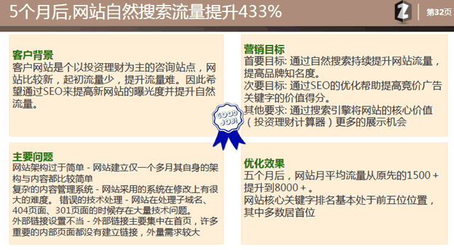 说句实话,每次客户都很在意我们有什么案例,但是每次真的说案例时客户又显得很不在意。所以我觉得案例这块部分,选择你公司最有代表性的,最有名气的就可以了。很多seo公司的案例都会添油加醋,所以大家无需转牛角尖,案例不能体现你个人的水平只是像一张文凭而已,有没有本事都是看这个新项目最后效果的。那写案例这块一个模板,建议大家发挥自己想象力,好看,有数据最重要!你可以借鉴一下方式: