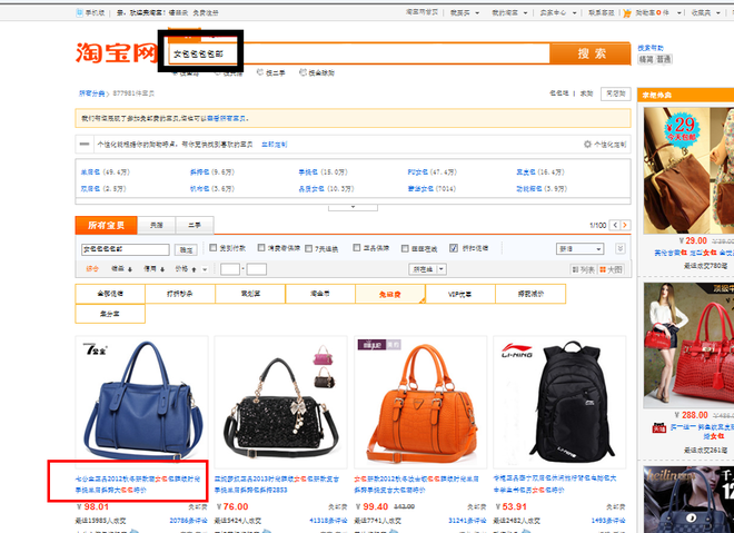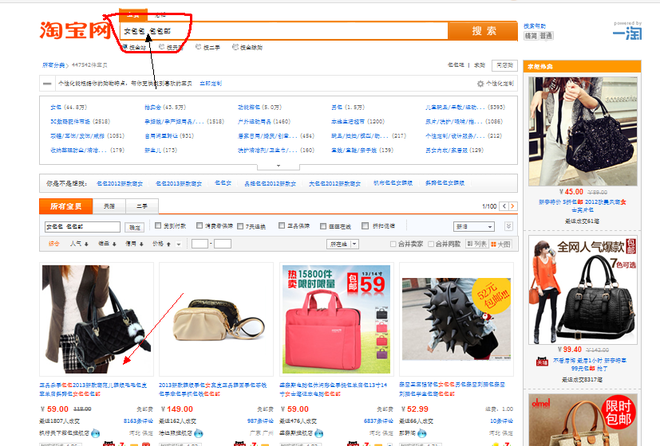 我们以“女包包包包邮”为列子说明。如果按照正常的逻辑来计算,不考虑分词系统的情况下,应该拆分成“女包”“包包”“包邮”这三个关键词。我们可以看到淘宝系统反馈的结果同样也是也这三个关键词为搜索条件。目前反馈的结果中,我们也看到了,女包,包包作为独立的词,没有包邮,因为淘宝默认跳转到了免邮费这一栏里面。