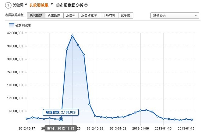 12.24日,淘宝首页扶持之后,"长款羽绒服"一词的展现指数暴增到3400万;