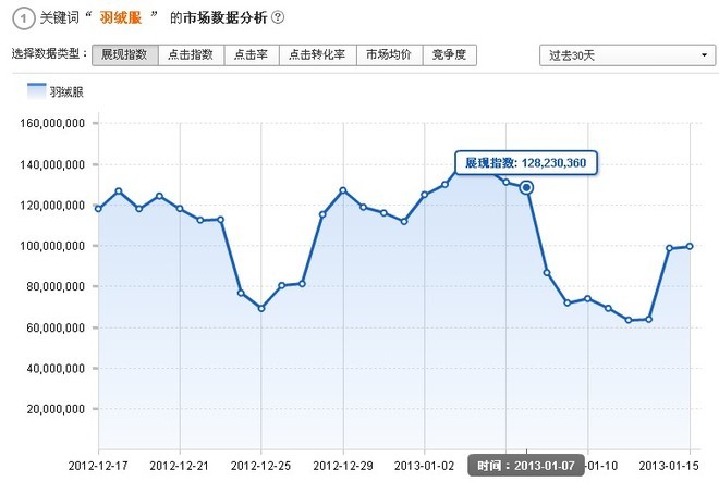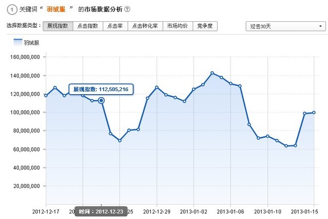 12.23日,"羽绒服"一词的展现指数还维持在1.125亿;