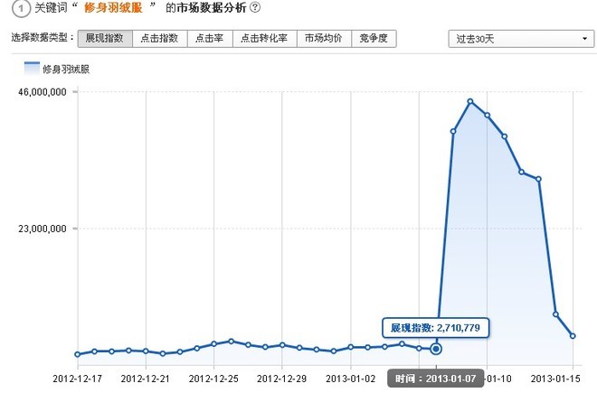 1.08日,淘宝首页扶持之后,"修身羽绒服"一词展现指数暴增到3900万;