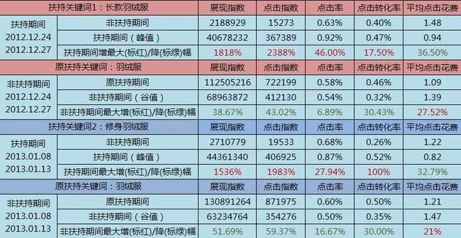 扶持期间,该词的展现和点击指数都会暴增,像"长款羽绒服"和"修身羽绒服"这两个扶持关键词,都突破了4000万大关,而且,点击率和点击转化率都会有不同幅度的提升,平均点击花费(PPC)则会出现明显下降;