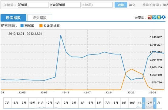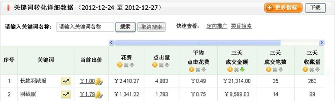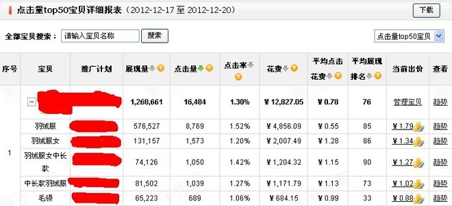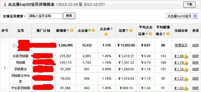 12.26日:25日日限额还是超了,因此,继续压低”长款羽绒服”的出价,排名压到百名开外;看了看25日的花费情况,发现”羽绒服”一词的一词的流量下滑严重,查看流量解析才发现,原来之前扶持的关键词是”羽绒服”,现在被”长款羽绒服”所代替,”羽绒服”一词在出价不变的情况下,展现爆跌了3600万,流量下滑是很正常的,于是适当抬高了”羽绒服”一词的出价。