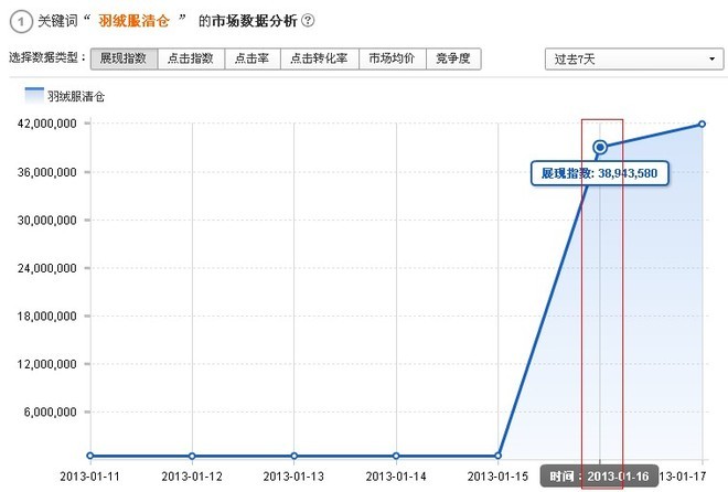 与之前一样,扶持关键词"羽绒服清仓"一词,展现指数在扶持的第二天图破了4000万,达到扶持顶峰!