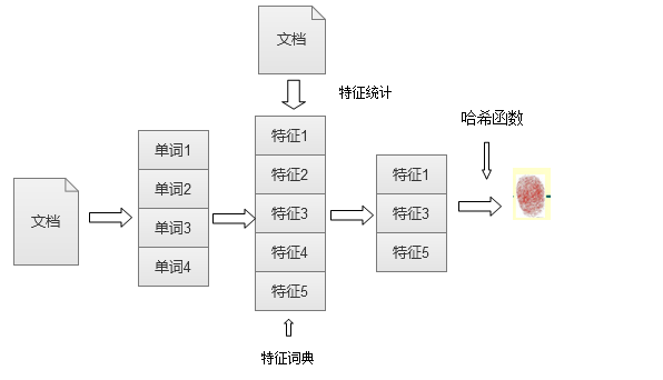 获得全局特征词典之后,对需要去重的页面,扫描下就能获得该页面上出现的所有单词,对于这些单词根据特征词典过滤:保留在特征词典上出现的单词,用来表达文档的主要内容,删除没有在特征词典中出现的内容。提取出对应的特征词之后在利用哈希函数对特征词汇进行哈希计算,获得的数值就是该文档的文本指纹。