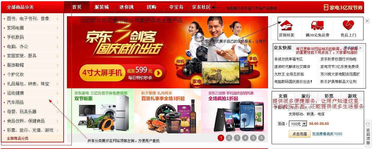 京东网上商城:告诉用户本站的名字,品牌,京东;网上商城,说明此站是一家做电子商务的网站,是在网上卖东西的