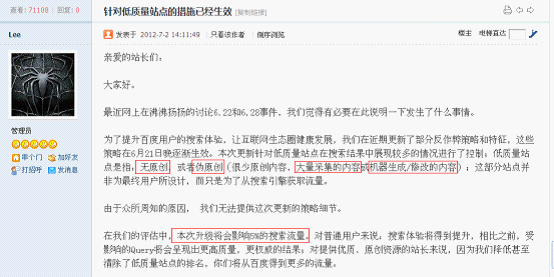 除上述公告外,Lee曾透过Robin在非正式场合,传达一个信息,百度这次不仅仅是针对站内质量,同时会狠杀有站群嫌疑的站点。
