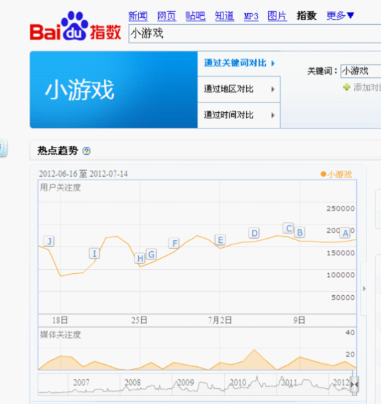 第二张图是国内著名游戏网站4399的指数截图,可见其指数逐渐超越百度中搜索小游戏的指数。