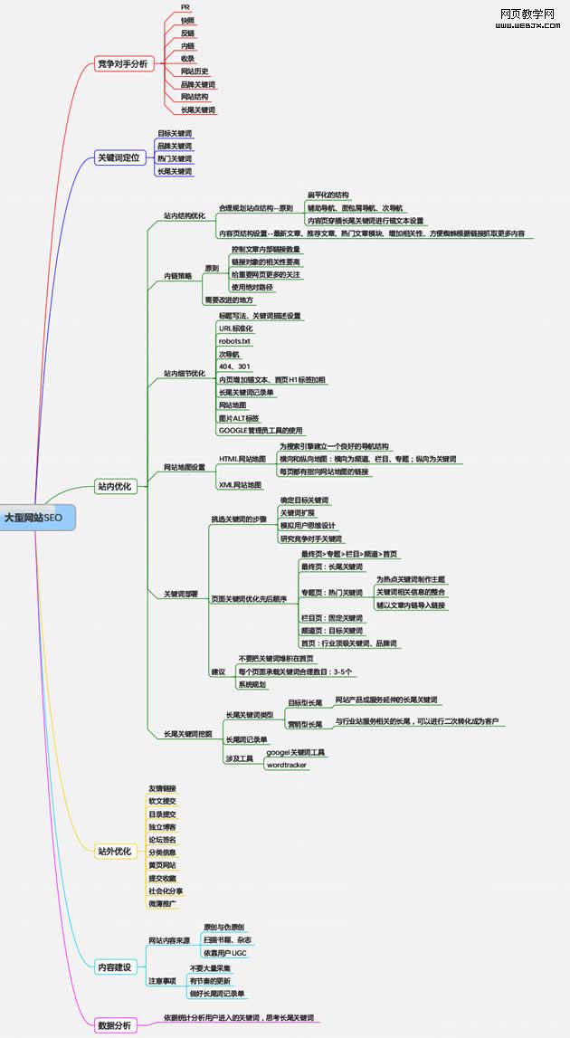 SEO的操作,从关键字的选择,竞争对手的分析,内容的建设,内链外链的建设以及后期的数据分析,实际上,东西非常少,下面这张图或许可能让初学SEO的你对SEO有个全景的认识。