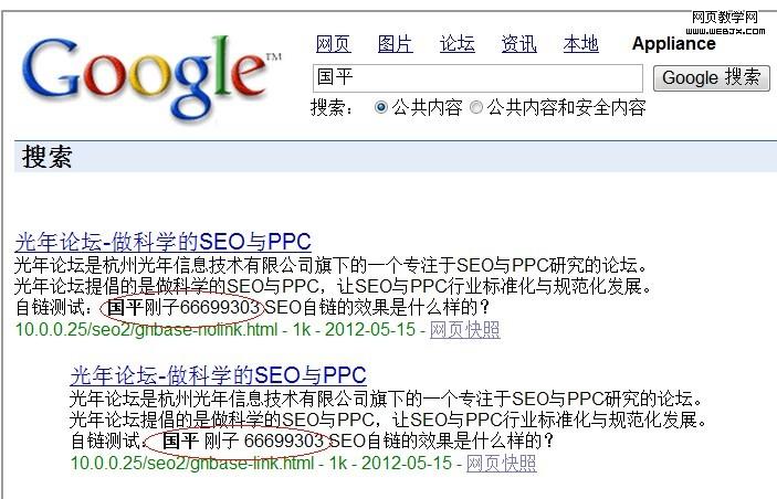 PS:测试的时候疏忽掉了,link这个页面是14号已经抓取并收录过的,nolink是15号新加上去的,开始测试link显示的日期为2012-05-14,后来发现后改了一下页面,GSA自动重新抓取了一次,link页面的日期才同步到15号。在搜索三个测试词的时候,link虽然抓取早,但是排名却没有后抓取的纯文本页面高。不过在搜索页面标题的时候,还是先抓取的link页面排名高。