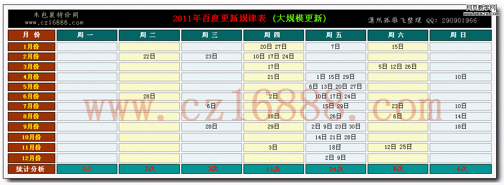 自2008年开始自学网页设计和初涉SEO,吸取SEO论坛,站长之家,A5站长网等业内高手的经验,曾服务过的一些网站10余个网站的实战经验并参考和引用一些权威网站的专业数据,进行长期观察与统计,现就2011年1-11月百度大更新方面数据进行统计分析,如有不妥之处,请各位高手海涵。