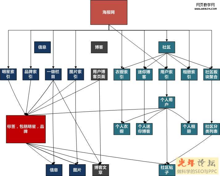 1.独特的栏目+标签网站结构,整个网站的只有一级栏目,每个栏目下面都有一套标签,标签之间还有上下级关系,信息(其中包括,图片,明星,品牌),博客,社区都围绕着栏目和标签进行分类聚合,不仅页面的相关性高,而且方便调用;这也充分考虑了网站的持续发展,灵活性高,我能观察到的旧页面是2007年的海报网首页,到现在有4年多了,她的网站结构和页面几乎没有发生过什么变化,我想这也是她关键词排名好的一部分原因。