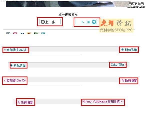 4.优化网站结构的小细节。在图片页面,明星页面,品牌页面,衣橱页面,相册页面,这些页面中,每个页面都有上一篇,下一篇类似的链接,也就是说,顺着上一篇和下一篇链接,就可以浏览完所有的页面,这也为蜘蛛爬取页面增加了路径,收录不是很好的朋友们,可以参考一下这个小技巧。