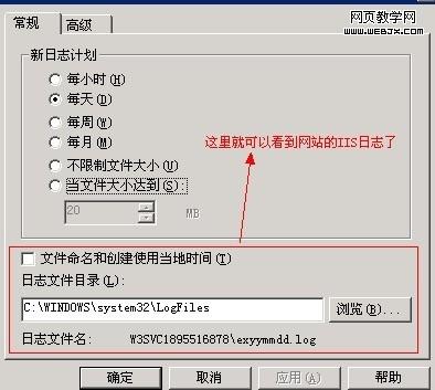 默认状态下,IIS 把它的日志文件放在 %WINDIR\System32\Logfiles 文件夹中。每个万维网 (WWW) 站点和 FTP 站点在该目录下都有一个单独的目录。在默认状态下,每天都会在这些目录下创建日志文件,并用日期给日志文件命名(例如,exYYMMDD.log)。如:ex100326.log