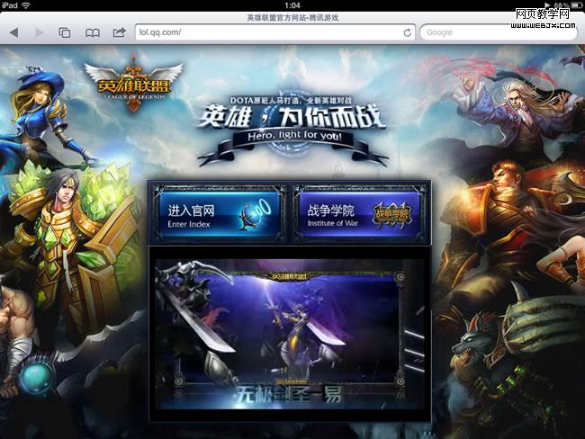 对于iPad和iPhone,主要问题是其不支持Flash。LOL官网有两处,一是引导页的视频,二是首页的下载按钮。实现起来很简单,使用JS判断浏览器信息(navigator.userAgent),如果是iPad和iPhone,使用HTML5视频技术替换引导页的Flash播放器,屏蔽首页的Flash下载按钮的插入,保持其为一个a标签的链接。