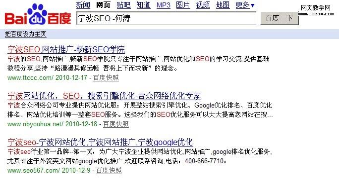 学过程度或者说懂点的都知道一般*号代表通配符,任一的意思。可惜的是这个指令不支持百度,用法大家可以上GG试试看;我们来看下减号的用法。直接举例我们来看结果:比如我们搜索“宁波SEO -何涛”