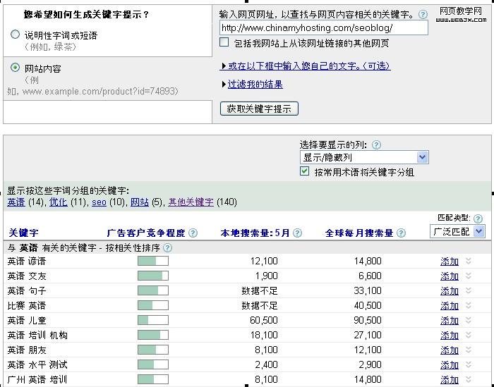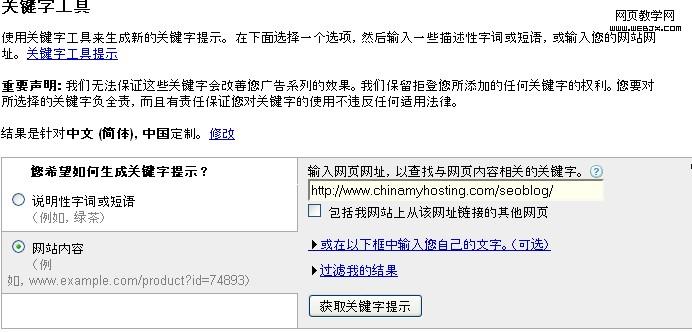 图3-4 在Google关键词工具选择按“网站内容”生成关键词
