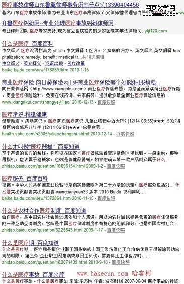 今天并不是来批判百度的,但这张图可以很好的说明百度对于自家产品的过度偏爱。最上面的是百度的赞助广告,然后依次是百科,知道,文库。呵呵,可以说百度全家上阵了,还好百度现在只有这几个项目,如果再多一点,估计各位小站长连西北风都喝不到了。你可能觉得是这个词没有多少人竞争,造成了这种情况,这点就错了。首先,医疗这个词的利润很高,做过google广告的应该都知道,这是单价最高的几个词之一,做的人不会太少。其次,百度这个搜索结果的第二页,分别是搜狐,天涯,网易,新浪一家不少。