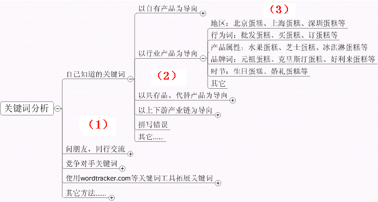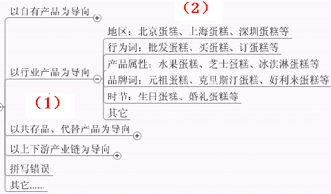 另外,在用上述方法拓展出来的某些组别的关键词往往也可以归类于步骤二中的某些大类别。比如说1.1.4)品牌词(元祖蛋糕、克里斯汀蛋糕、好利来蛋糕等)就可以归入1.3)以共存品、替代品为导向的关键词分类中。