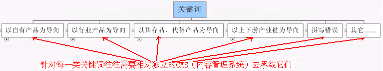 在第一个层次的分组中,从“以自有产品为导向”的关键词分组开始到以“上下游产业链”为导向的关键词分组的若干分组中。一般情况下,这些大的逻辑分组甚至需要相对独立的CMS(内容管理系统)去出载它们。如下图所示: