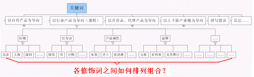 下面我们进入下一个逻辑层次。在上面相关逻辑层次中,同样从1.1) 到1.5)中的每个一个步骤还可分为若干小步骤。比如以“1.1)自己所知道的关键词》以行业产品为导向的关键词中”为例,这时假设我们的主关键词为“蛋糕”,那么还可在主词的基础上添加相关修饰性的词语从而组成长尾词,这些修饰词就比如:1.1.1)地区性的词语(北京、上海、深圳);1.1.2)行为词(买蛋糕、订蛋糕、网上预订蛋糕);1.1.3)产品属性(水果蛋糕、芝士蛋糕、冰淇淋蛋糕等);1.1.4)品牌词(元祖蛋糕、克里斯汀蛋糕、好利来蛋糕等);1.1.5)时节类的词语(生日蛋糕、婚礼蛋糕等);1.1.6)其它。