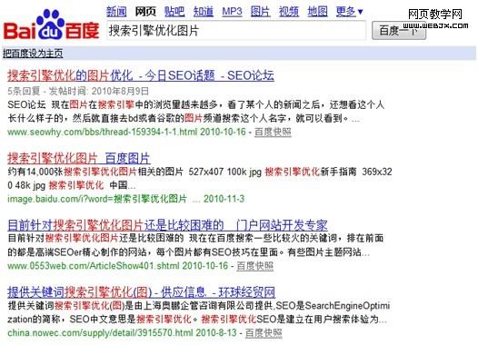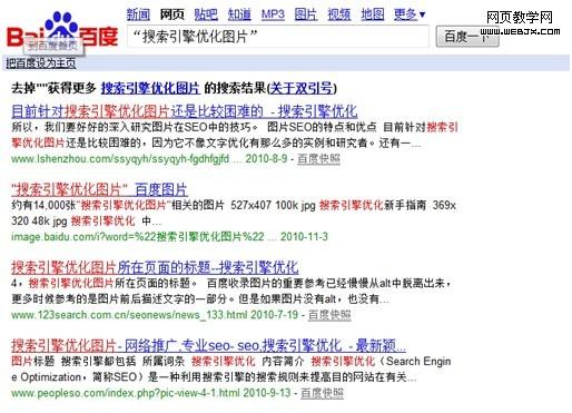 在输入了含有双引号的关键词后,返回的结果是完全匹配了关键词“搜索引擎优化图片”文字的结果,而下面的图片则是包含关键词“搜索引擎优化图片”且可能是分词或组合词的结果