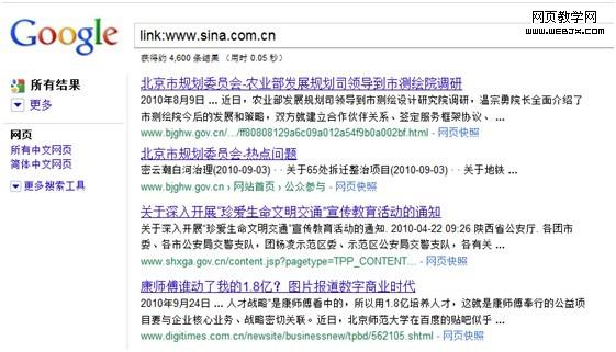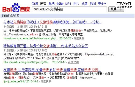 这条指令也是做SEO工作最常用的组合搜索,意为网址中含有edu.cn(这个不用说,教育类网站,权重高嘛)的内容中有“交换链接”字样的信息。这样的组合搜索可以帮助我们找到需要交换链接的站点,同时可以快速的寻找高价值的外部链接。