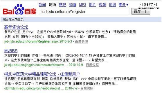 此条指令可能很多人不明白是什么意思,“inurl”——网址中包含edu.cn的网站同时含有forunm和register这2个单词,*为通用符。因为大家常用forunm和register表示注册页面。最终表达的意思所有教育类网站的注册页面,这样很容易找到高价值的论坛来供大家发布外部链接
