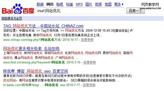 关键词“网站优化”在搜索结果中有链接,这是大家经常在做外部链接时候常用的锚文本,检查是否有效果的最有效方式,下图为搜索结果的第一条中含有锚文本的区域。便于大家更容易去理解这条命令,可惜的是inanchor:只适合在google中使用。