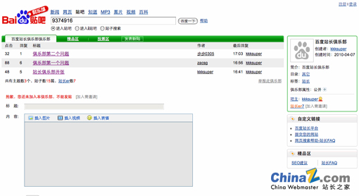 据了解,这个站长俱乐部吧是在4月7日成立的,而关于俱乐部的开张帖则是在今天下午2点发布的。在帖子中,吧主kkksuper称,希望通过这个俱乐部,搭建百度与站长之间的沟通桥梁。