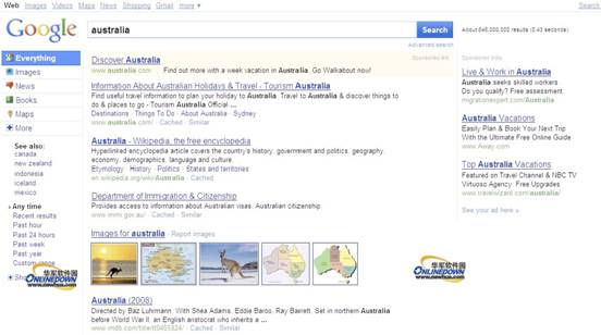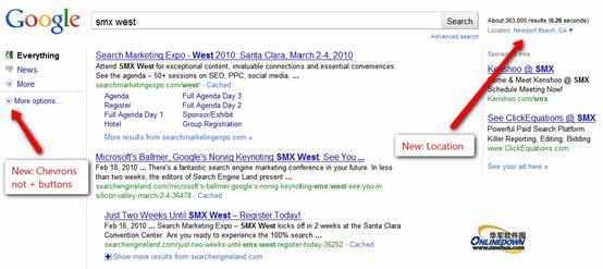 另一方面,新主页被分为三个大板块,暂时我们还无法猜测其功能按钮的具体分布情况。但谷歌实验室一直在研发的实时搜索、个性化过滤设置等都将提供给用户使用。其搜索结果排列在页面右侧顶端,用户可以根据需要选择下拉菜单中的功能选项或修改本土信息。
