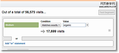 在你分析之前,首先要登陆到你的网站分析工具的高级Segmentation工具,创建一个来自搜索引擎自然流量的segment。来源-》包含-》Google,yahoo,Bing 等等。