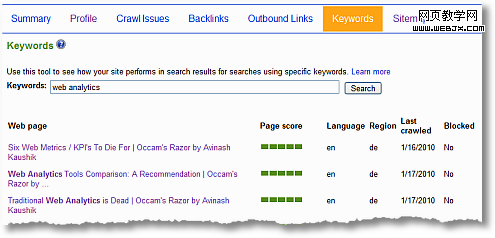 收录….Google webmaster tool是一个很优秀的免费工具,此外Bing webmaster tool也很不错。无论你使用哪个工具,你都可以通过这个工具了解到你的网站的收录情况,哪个关键词排名在搜索引擎上表现比较好,你也可以检查看看是否: