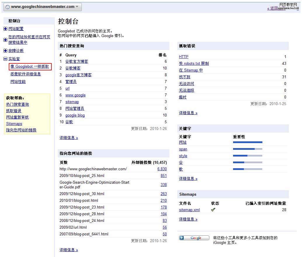 首先,登入网站站长工具中,“像Googlebot一样抓取”功能就会出现在实验室版块的导航菜单的最下方: